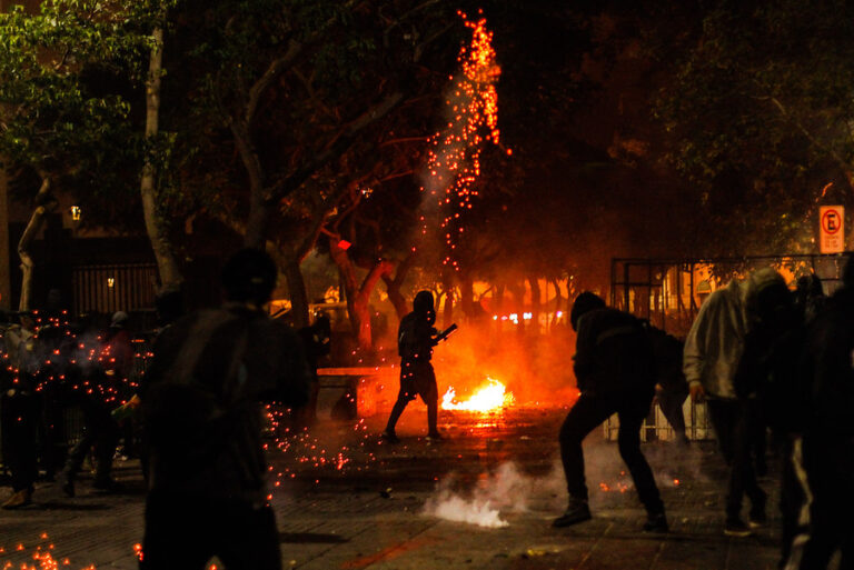 Imágenes de video muestran a los manifestantes rompiendo ventanas, quemando objetos afuera y arrojando piedras sobre las paredes.