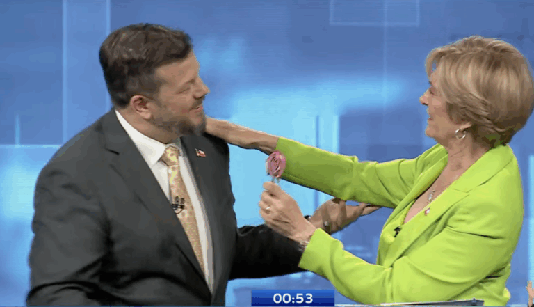 "Me voy a permitir una libertad", dijo Kaiser, sacándose de su chaqueta una rosa y entregándosela a Matthei que, sorprendida, le agradeció en Alemán.