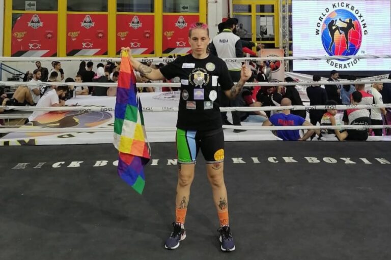 La deportista, que obtuvo la presea plateada en el Mundial de Kickboxing disputado en el país árabe, contó cómo la exhibición de la bandera wiphala le trajo problemas, al ser confundida con el símbolo LGBT.