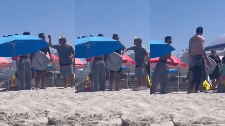 El video captura el instante en que un padre, acompañado de su hijo en la playa, reprende a un hombre por su comportamiento. Con evidente indignación, el padre confronta al sujeto, quien se hallaba frente a él, mientras varias personas interceden para separarlos.