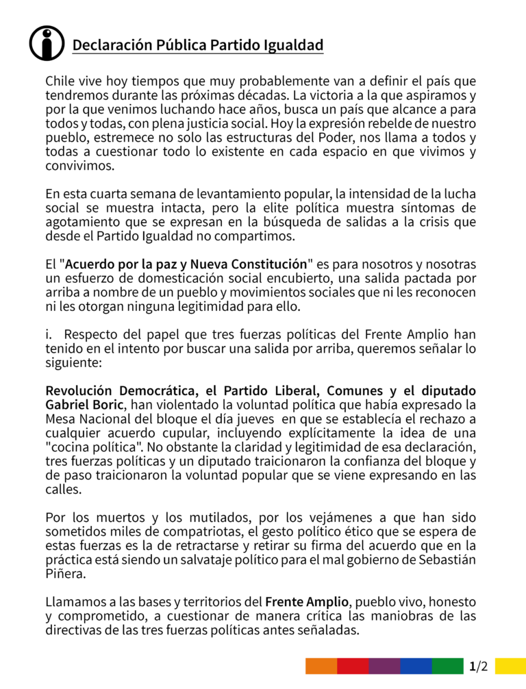 A través de una declaración pública, la agrupación declara que Revolución Democrática, el Partido Liberal, Comunes y el diputado Gabriel Boric "han violentado la voluntad política que había expresado el bloque en que se establecía un rechazo a cualquier acuerdo cupular, incluyendo explícitamente la idea de una 'cocina política'".