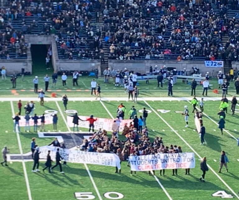 Ambas instituciones poseen bonos de Puerto Rico, así como lazos con compañías de combustibles fósiles, que aceleran el daño al planeta. Casi cien alumnos se manifestaron utilizando camisetas alusivas a cada centro educativo y alzando varios carteles, retrasando el encuentro que finalmente ganó Yale 50-43.