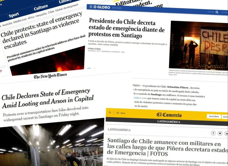 Frente la contingencia, diversos medios internacionales amanecieron con portadas relacionadas a las manifestaciones realizadas en Santiago, enfatizando en el decreto firmado por el presidente Sebastián Piñera, el cual significa, entre otras cosas, la restricción del libre tránsito y de reunión.