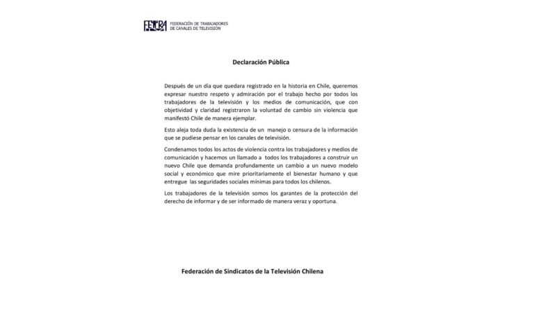 La FETRA compartió una declaración pública en que, además, condenan cualquier acto de violencia contra los trabajadores de los medios de comunicación, quienes según ellos registraron objetivamente la voluntad de cambio sin violencia que manifestó Chile, alejando toda duda acerca de la existencia de un manejo o censura de la información.