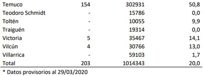 Otra región que llamó la atención fue de Ñuble, tanto por su número de contagiados (162) como por su enorme tasa de incidencia (31,7). Aún así, la situación en la comuna de Chillán es aún más preocupante con 114 pacientes positivos al COVID-19 y una tasa de incidencia del 57,4.