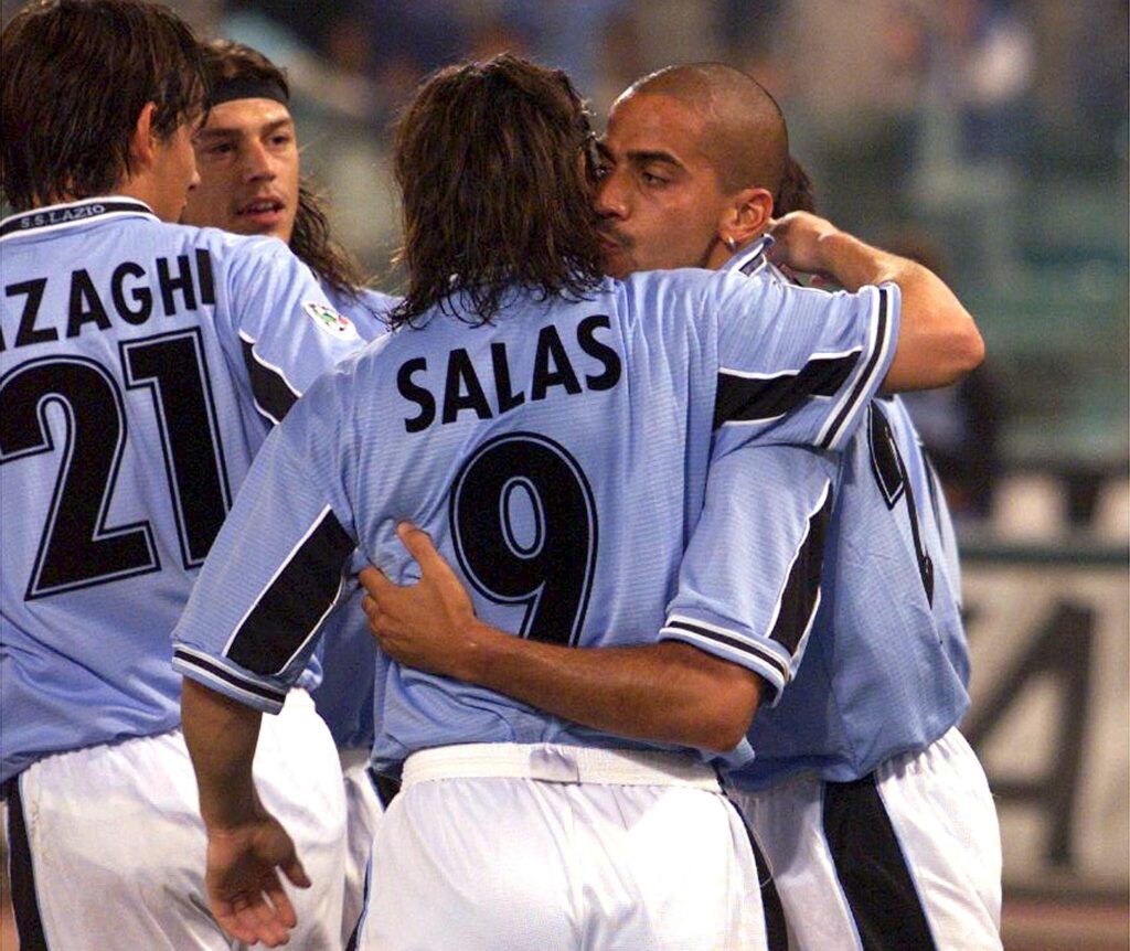 El mediocampista argentino de la Lazio, Juan Sebastián Verón, celebra su gol ante Cagliari junto a su compañero chileno Marcelo Salas, durante el duelo por la Serie A disputado en el Estadio Olímpico de Roma. Crédito: EPA/ANSA – Alessandro Bianchi.