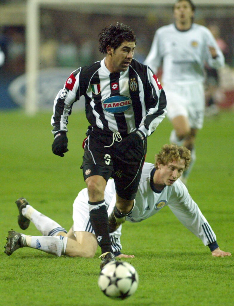 El delantero chileno de la Juventus, Marcelo Salas, escapa de la marca de Tiberiu Ghioane del Dynamo Kiev, durante el partido por el Grupo E de la UEFA Champions League disputado en la capital ucraniana. Crédito: EPA/Sergei Supinsky