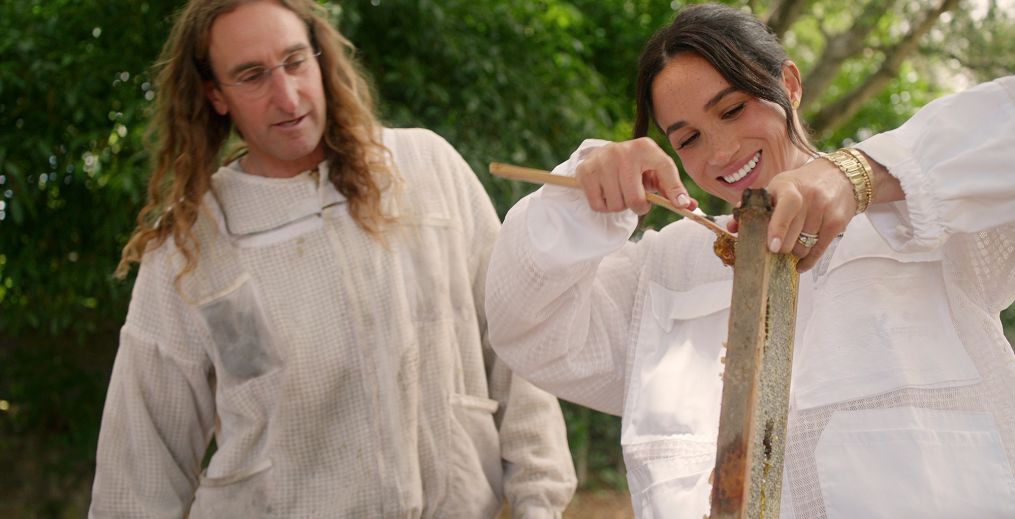 Acompañada de brillantes primeros planos de flores amarillas, la serie comienza con Meghan observando cómo el apicultor Branden Aroyan abre una colmena para recoger la miel que contiene.