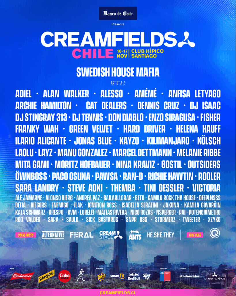 Pero también son nacionales los que darán vida a esta nueva edición de Creamfields, con un line up que completan Ale Jamarne, Alonso Bierg, Andrea Paz, Beto, Camilo Rock Tha House, Deeplnsss, Delia, Diegors, Enemigo, y más.