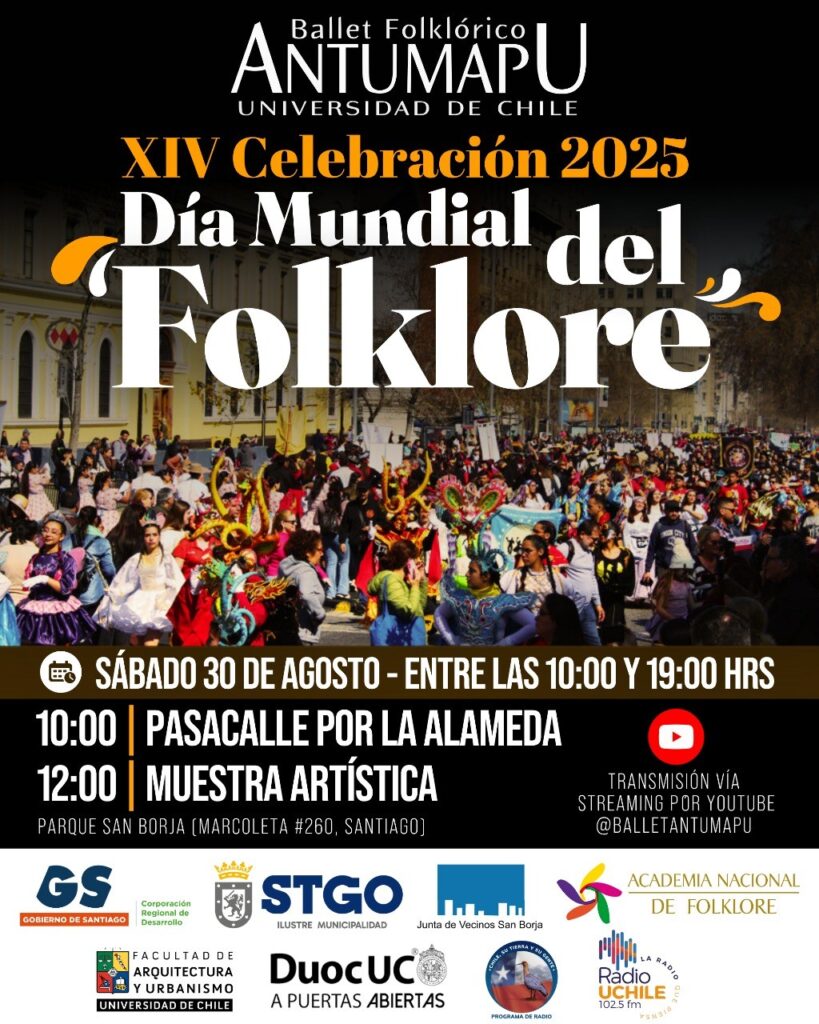El próximo sábado 30 de agosto, Santiago será escenario de la XIV versión del Día Mundial del Folklore, una celebración que reunirá a más de dos mil artistas en el tradicional pasacalle por la Alameda y que continuará con un evento central en el Parque San Borja.