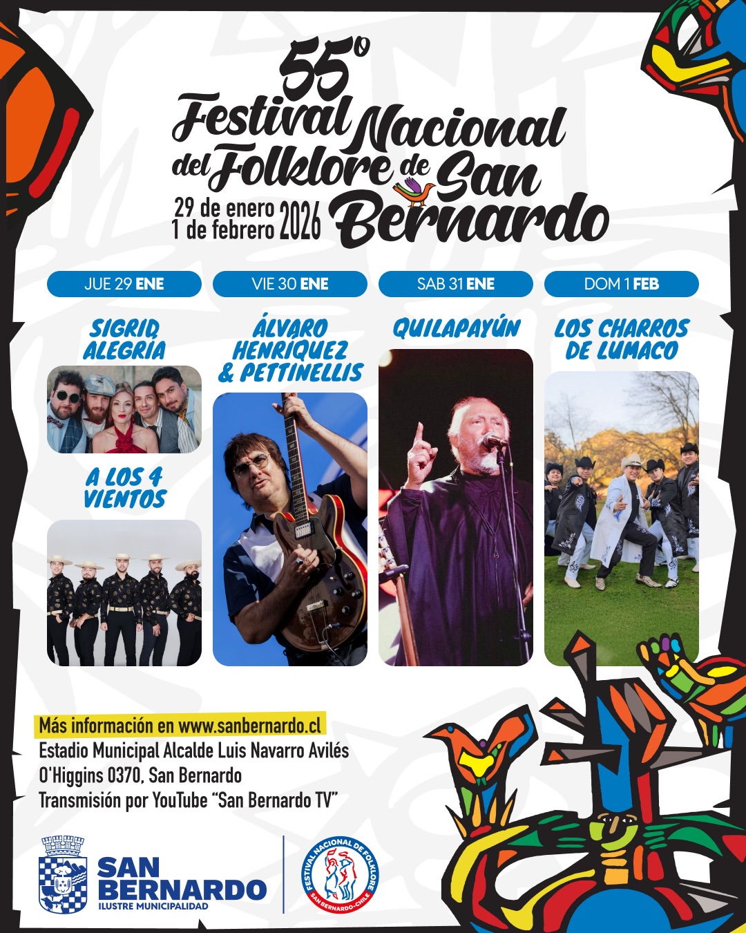 La actividad cultural se desarrollará entre el 29 de enero y el 1 de febrero de 2026 en el Estadio Municipal Alcalde Luis Navarro Avilés, ubicado en la comuna de San Bernardo.