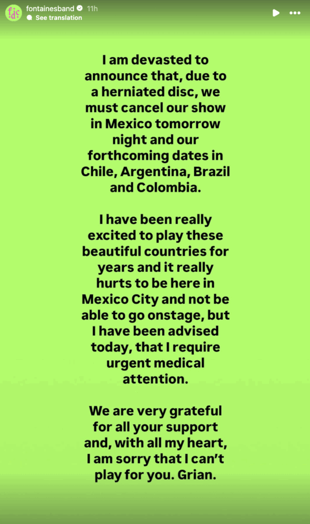 “Me devasta tener que anunciar esto, pero debido a una hernia discal debemos cancelar nuestras presentaciones”, indicó en un texto publicado a través de sus historias de Instagram.