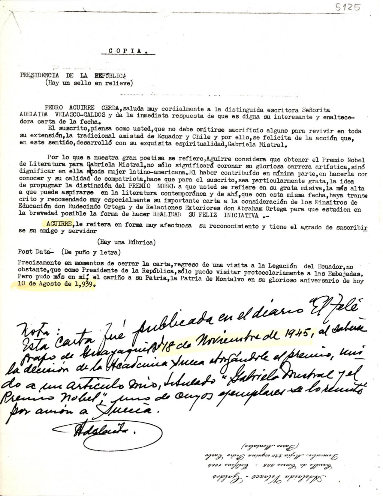 “Voy a contar cómo surgió mi candidatura para el Premio Nobel. La idea nació de una amiga mía, Adela Velasco, de Guayaquil, quien escribió al extinto presidente de Chile, señor Aguirre Cerda, que fue compañero mío, y sin consultarme presentó mi candidatura. En este momento tengo también que recordar a Juana Aguirre, esposa del Presidente”, reveló en una entrevista a United Press en 1945.
