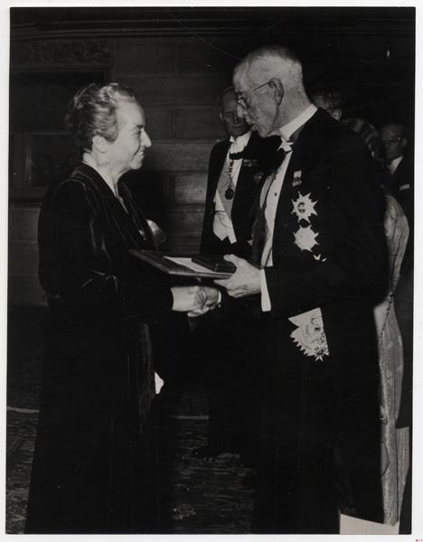 [Gabriela Mistral, recibe el Premio Nobel de Literatura de manos del Rey Gustavo V de Suecia; Palacio de Conciertos de Estocolmo, 10 de diciembre de 1945] [fotografía]. Estocolmo : [autor no identificado], 1945. Fotografía : monocromo, gelatina sobre papel fibra ; 18,5 x 24 cm.