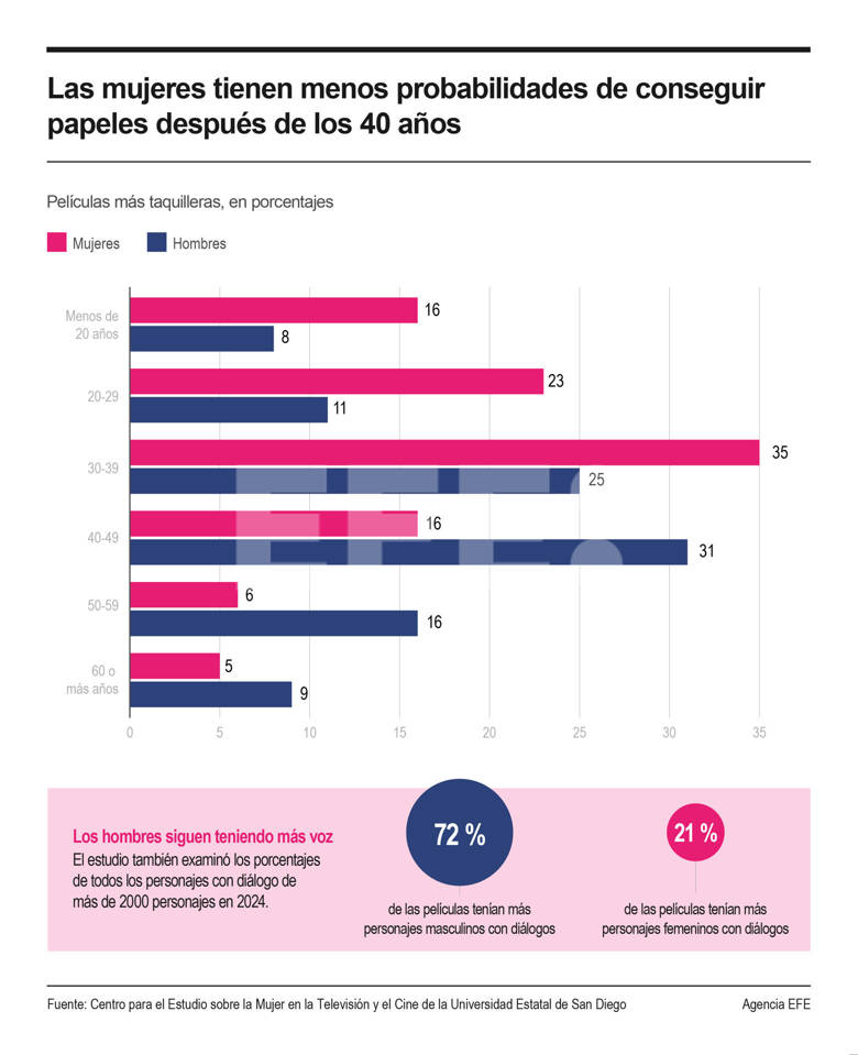 Respecto a los datos desglosados por edad, el porcentaje de personajes femeninos cayó del 35% en la actrices de treinta años, frente al 16% en sus cuarenta.