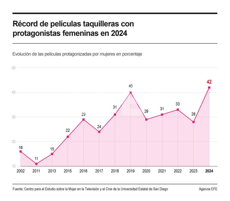 Hollywood logró en 2024 el hito de equiparar el porcentaje de las protagonizadas por mujeres con las que contaron con hombres como protagonistas, según un estudio del Centro para el Estudio sobre la Mujer en la Televisión y el Cine de la Universidad Estatal de San Diego, que identificó que ambos géneros lideraron el 42% de los filmes más taquilleros.