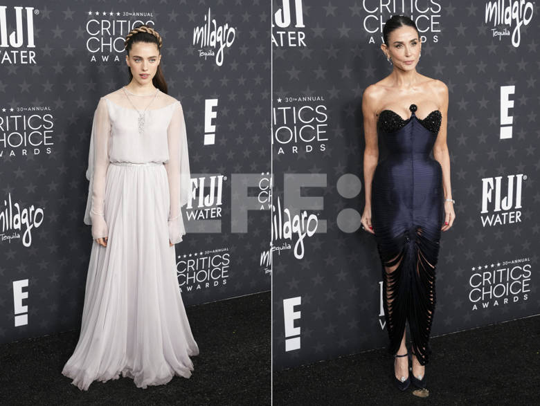 Fotografías de las actrices Margaret Qualley (i) y Demi Moore posando durante la 30ª edición de los Critics Choice Awards en California (Estados Unidos). EFE/ EPA/ Allison Dinner