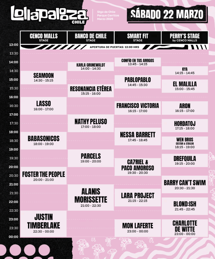 El sábado 22, Justin Timberlake liderará la programación con su concierto a las 22:30 horas en el Cenco Malls Stage.