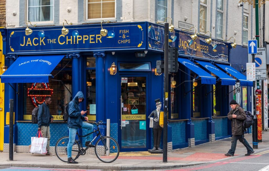 Numerosos negocios locales del este de Londres, incluida esta tienda de pescado y patatas fritas, comercian con la notoriedad de Jack el Destripador. Robert Evans/Alamy vía CNN Newsource