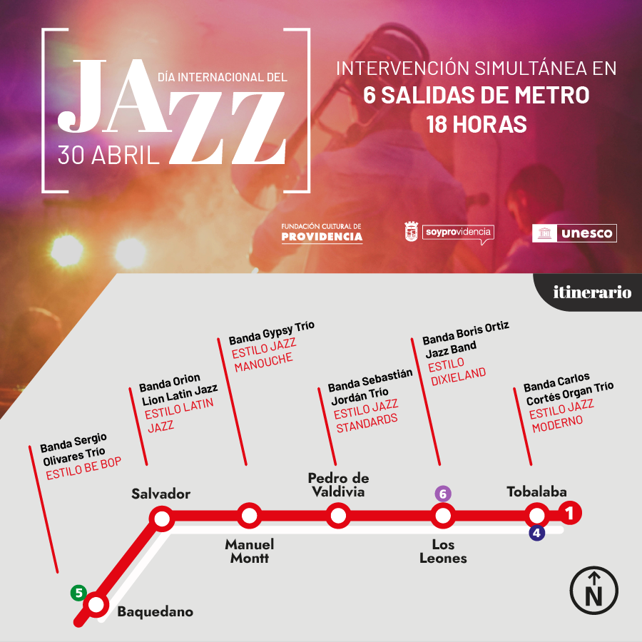 A partir de las 18:00 horas del 30 de abril, ensambles de jazz ofrecerán presentaciones en Baquedano, Salvador, Manuel Montt, Pedro de Valdivia, Los Leones y Tobalaba.