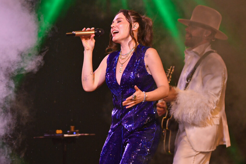 La cantante Joy, del dúo mexicano Jesse y Joy, aparece en la galería al inicio de su presentación en la Quinta Vergara, durante la tercera noche del Festival Internacional de la Canción de Viña del Mar 2026.