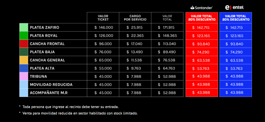 - La preventa exclusiva para clientes Banco Santander y Entel será desde el martes 3 de marzo a las 11:00 horas hasta el miércoles 4 de marzo a la misma hora o hasta agotar stock. Las entradas tendrán un 20% de descuento.