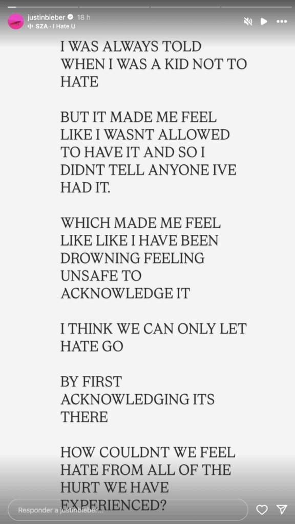 “La gente me ha dicho toda mi vida: ‘Wow, Justin te mereces eso’ y yo personalmente siempre me he sentido indigno”, escribió el cantante el jueves en una historia de Instagram.