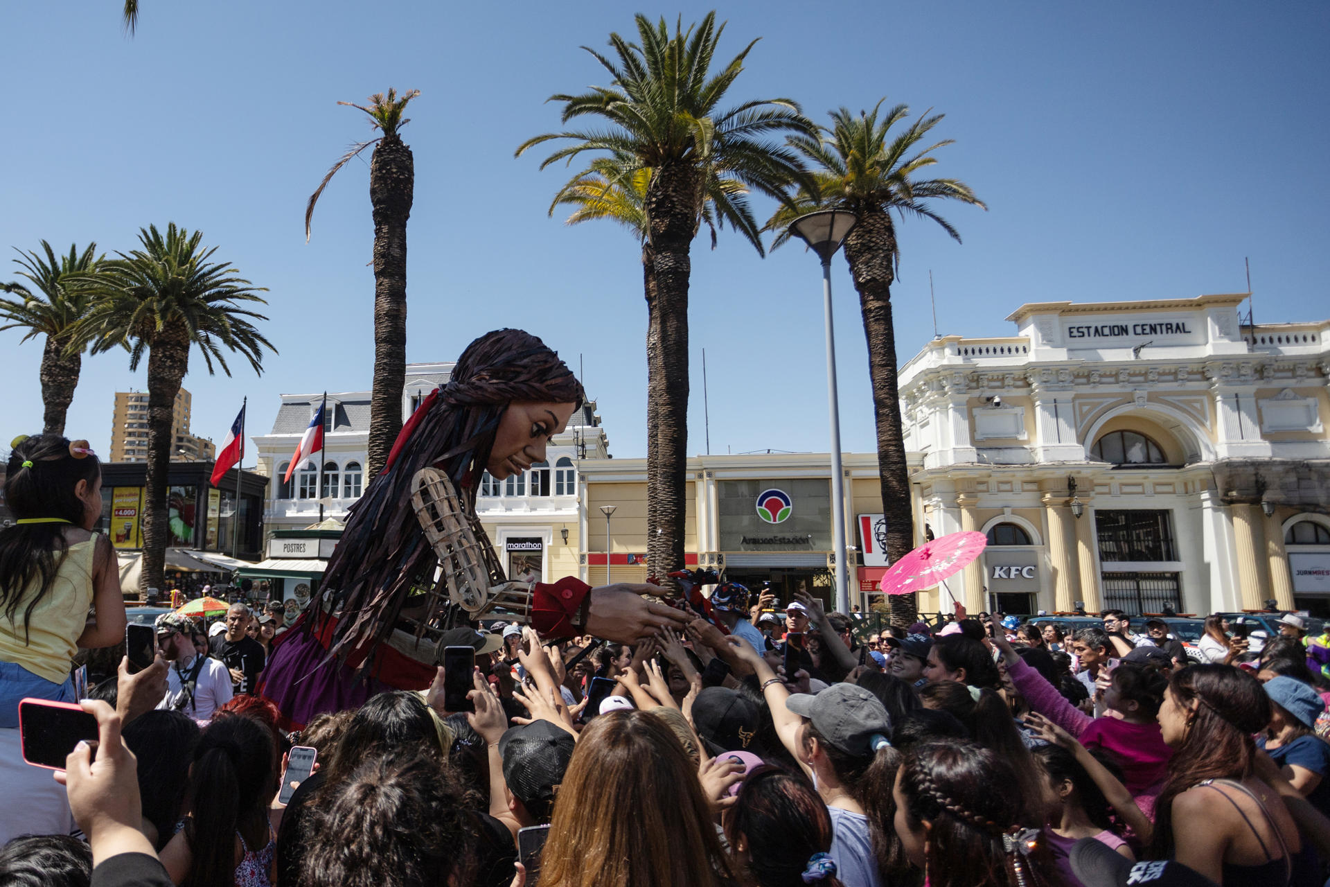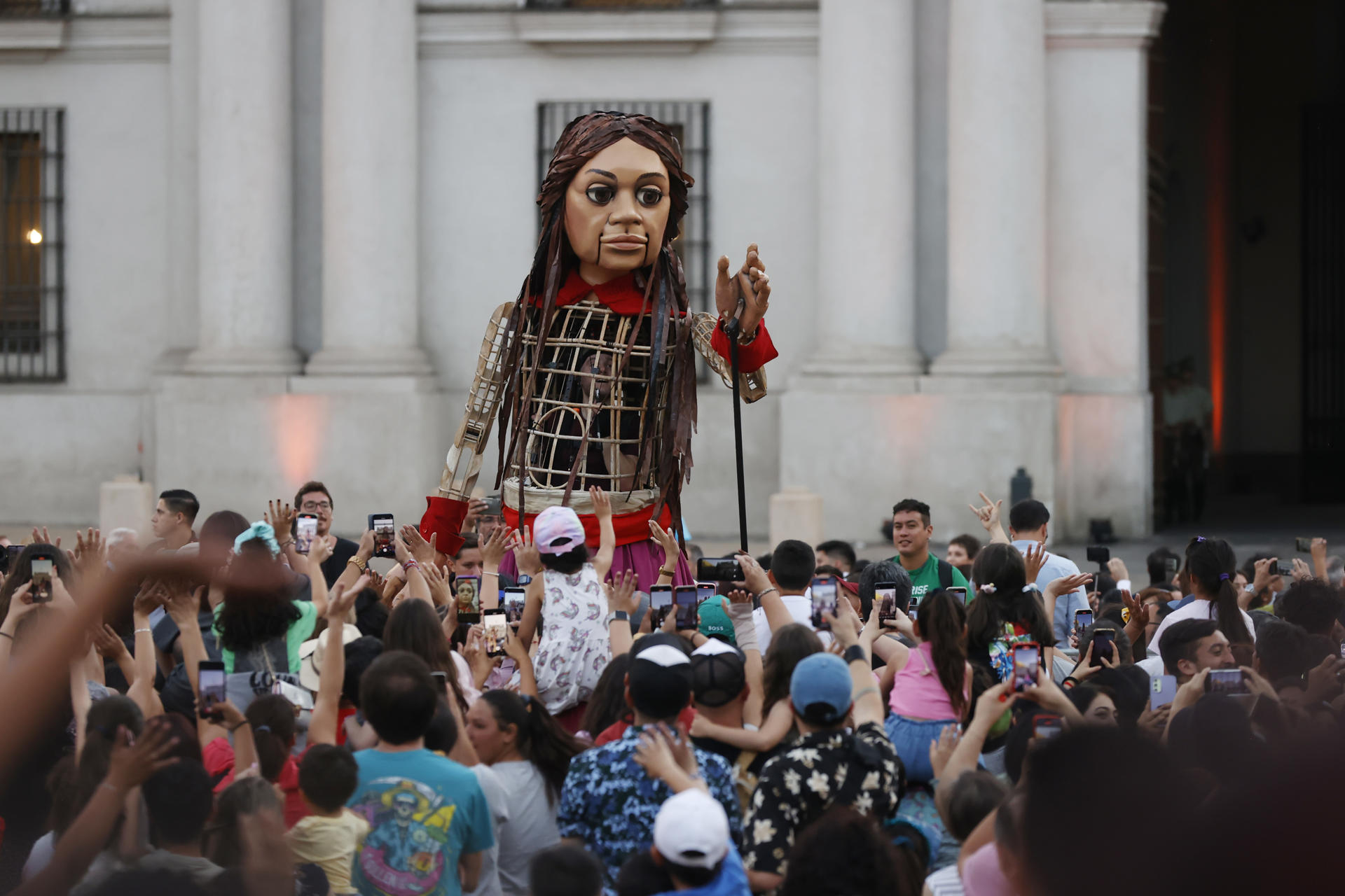 Varias personas observan la obra ‘Amal en Chile’, sobre una marioneta de 3.5 metros de altura que representa a una niña siria refugiada de 10 años, este viernes durante la inauguración del Festival Teatro a Mil, en la Estación Central, en Santiago (Chile). Crédito: EFE.