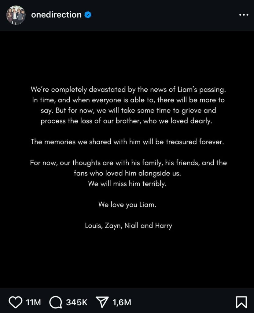 “Los recuerdos que compartimos con él serán un tesoro para siempre. Por ahora, nuestros pensamientos están con su familia, sus amigos y los fans, que tanto lo querían junto con nosotros. Lo echaremos muchísimo de menos. Te queremos, Liam. —Louis, Zayn, Niall y Harry”, firmaron los artistas.