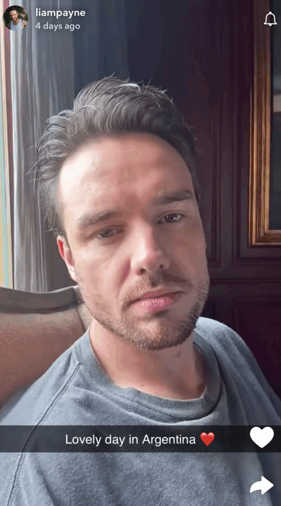 Publicaciones de Liam Payne en su cuenta de Snapchat el miércoles 16 de octubre | Snapchat @LiamPayne