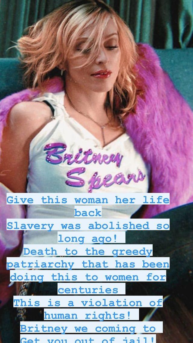 La reina del pop publicó una foto de ella misma con una camiseta que decía “Britney Spears” en sus historias de Instagram con la leyenda: “Devuélvanle la vida a esta mujer. ¡La esclavitud fue abolida hace tanto tiempo! Muerte al codicioso patriarcado que ha estado haciendo esto con las mujeres durante siglos. ¡Esto es una violación de los derechos humanos! ¡Britney, vamos a sacarte de la cárcel!”.
