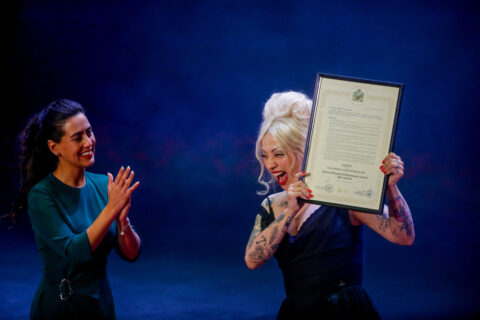Mon Laferte sostiene el decreto municipal que la nombra Hija Ilustre de Viña del Mar, en el Teatro Municipal de la Ciudad Jardín.