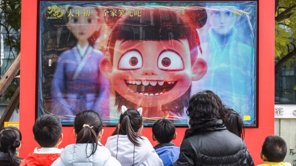 Personas observan un vídeo promocional de la superproducción animada china Ne Zha 2 en Chengdu, provincia china de Sichuan, el 10 de febrero de 2025. Visual China Group/Getty Images vía CNN Newsource