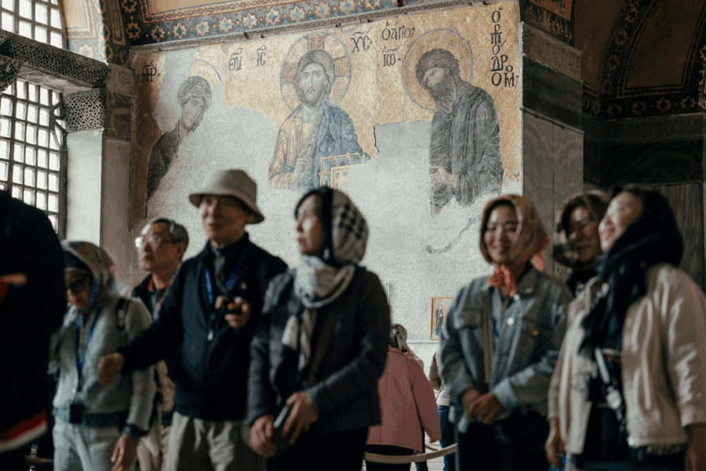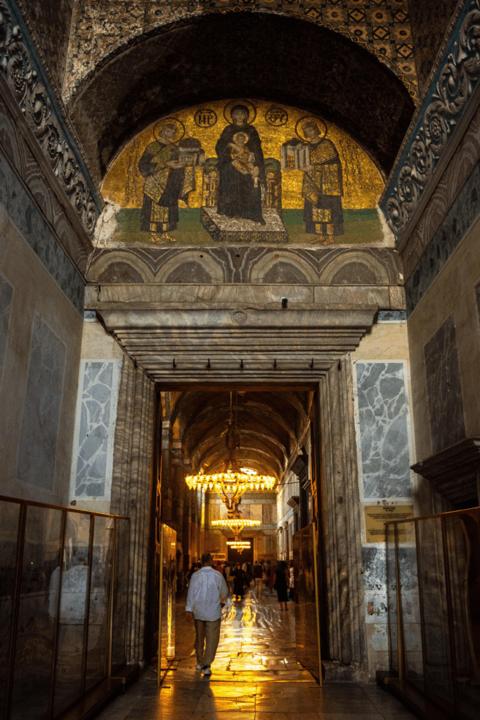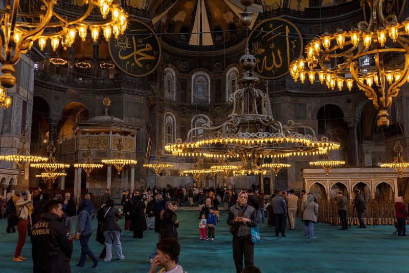 Y su arte interior da testimonio de la convivencia: mosaicos cristianos con santos y emperadores bizantinos conviven con la caligrafía islámica (Hüsn-i Hat), grandes medallones que exhiben los nombres de Alá, el profeta Mahoma y los primeros cuatro califas.
