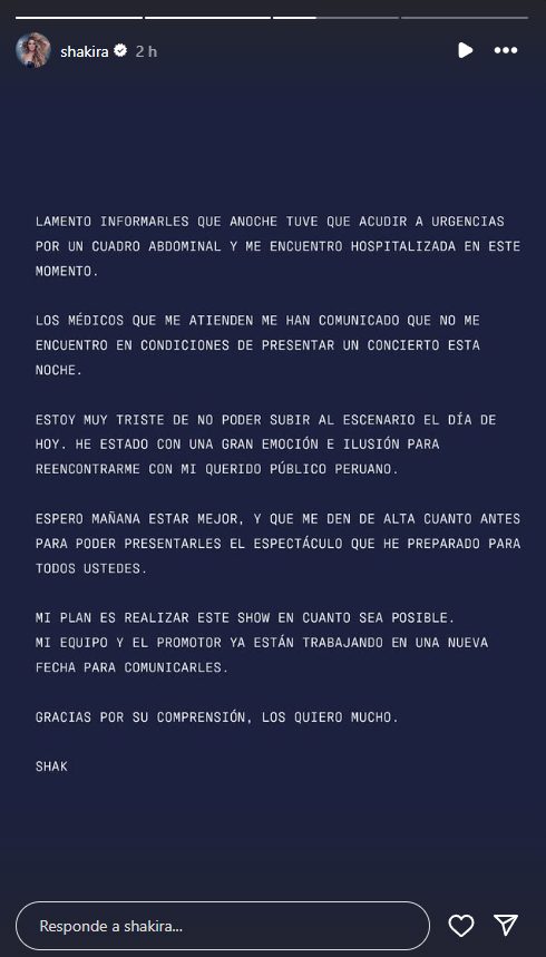 La información preliminar que recogieron los primeros medios decía relación con supuestos problemas médicos de la cantante colombiana, los que la habrían obligado a acudir a una clínica en la capital peruana.