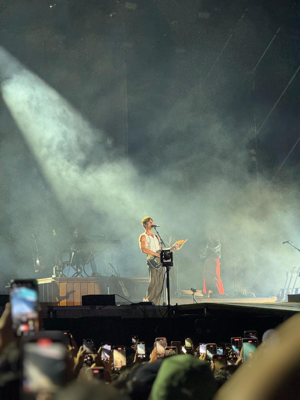 El show tiene una producción cuidada al milímetro, pero también momentos de espontaneidad que lo vuelven entrañable. Fuegos artificiales estallan en múltiples canciones, sincronizados con los clímax musicales. Hay una vibra muy marcada a lo John Mayer —uno de sus referentes confesos— que se filtra en varios pasajes instrumentales, donde las guitarras acústicas y eléctricas dominan la atmósfera, con solos intercalados.