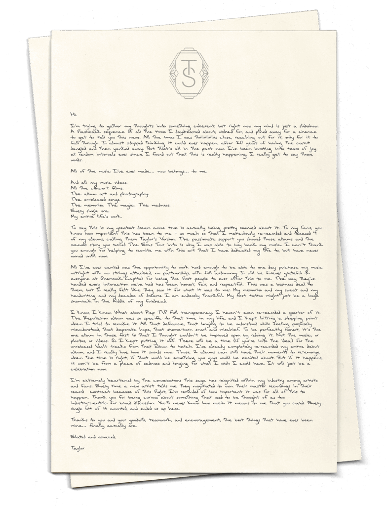 Me conmueven profundamente las conversaciones que esta historia ha encendido en la industria, entre artistas y fans. Cada vez que un nuevo artista me dice que decidió ser dueño de sus grabaciones maestras en su contrato discográfico gracias a esta lucha, recuerdo lo importante que fue que todo esto pasara. Gracias por interesarse en algo que solía considerarse demasiado “centrado en la industria” para una discusión amplia. Nunca sabrán lo mucho que significa para mí que se hayan preocupado. Cada paso que dimos contó y nos trajo hasta aquí.