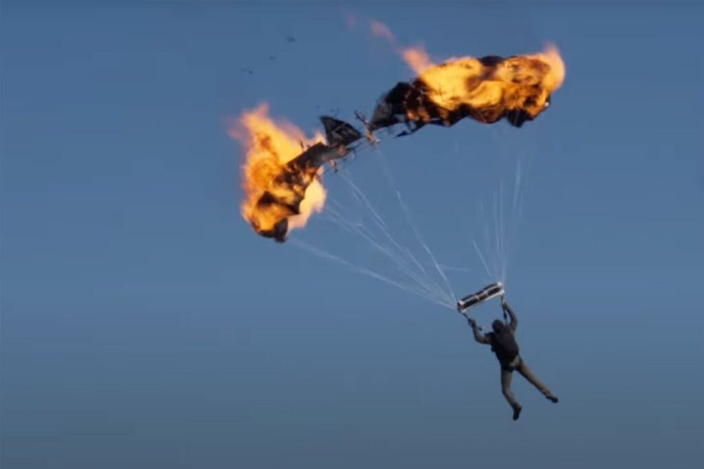 La secuencia, ambientada con la clásica banda sonora de Misión Imposible, muestra a Cruise lanzándose desde un helicóptero 16 veces con el paracaídas envuelto en llamas, en una impresionante sucesión de imágenes que destaca su disposición a realizar sus propias escenas de riesgo.