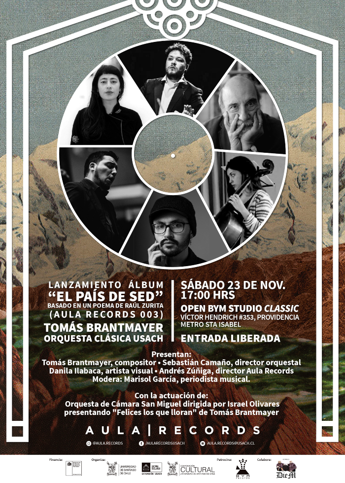 Este sábado 23 de noviembre, el Departamento de Extensión de la Universidad de Santiago (USACH) realizará el tercer lanzamiento de su sello discográfico, Aula Records, que presentará El país de sed, álbum de música clásica compuesta por el chileno Tomás Brantmayer en 1992 y que tuvo como inspiración a la poesía de Raúl Zurita.