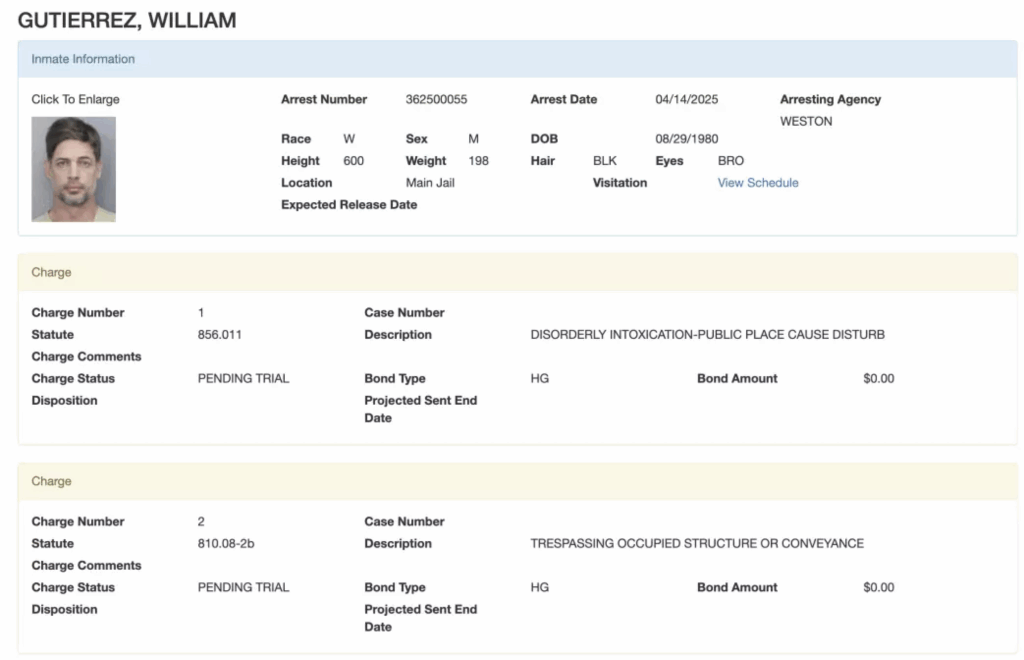 La Oficina del Sheriff confirmó que enfrenta dos cargos: uno por alteración del orden público bajo los efectos del alcohol y otro por ingreso a una estructura o vehículo ocupado sin autorización.