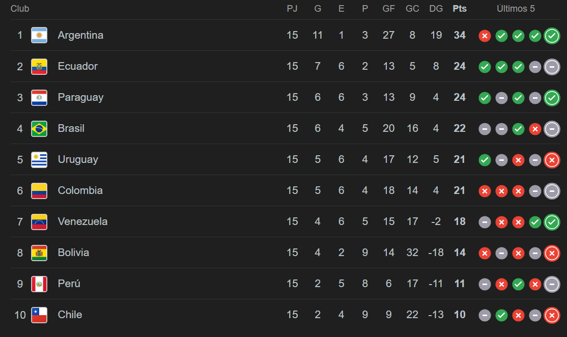 Un triunfo permitiría a Chile sumar 13 puntos y escalar al noveno puesto, superando a Perú y quedando a solo un punto de Bolivia, que actualmente es octavo. La posibilidad de alcanzar el repechaje aún dependería de que Venezuela (7°, con 18 puntos) no sume ante Uruguay en esta misma fecha.