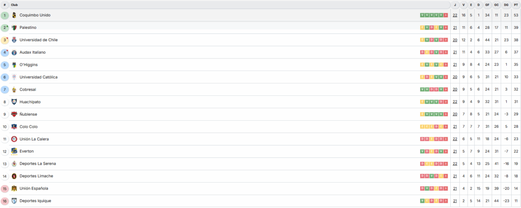 Con este resultado, el equipo dirigido por Esteban González alcanzó 53 puntos, manteniendo una ventaja importante sobre sus más cercanos perseguidores: Palestino, con 39 unidades, y Universidad de Chile, con 38.