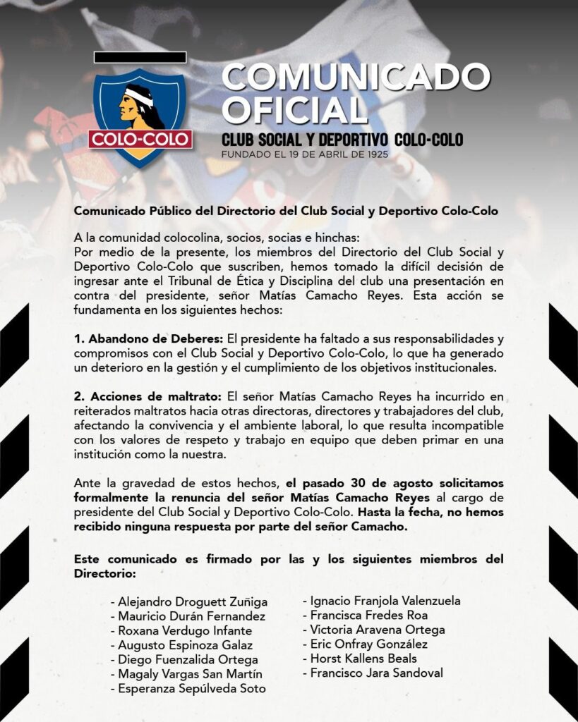 En un comunicado oficial, 13 miembros del directorio del Club Social y Deportivo Colo Colo han solicitado la renuncia del presidente Matías Camacho, a quien acusan de “abandono de deberes” y “acciones de maltrato”.
