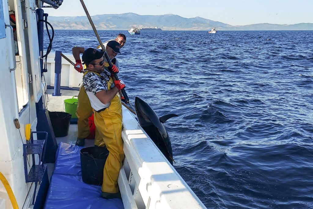 Españoles pescando en el Estrecho de Gibraltar con la ley “un hombre, un anzuelo, un atún rojo”. EFE/Isabel Laguna