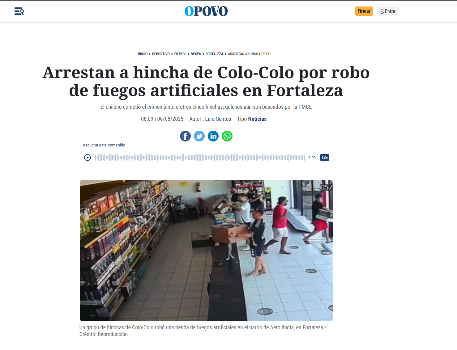 Un hincha de Colo Colo fue detenido este lunes 5 de mayo en la ciudad de Fortaleza, Brasil, tras ser acusado de robar cajas de fuegos artificiales a pocas horas del partido entre el club chileno y Fortaleza por la Copa Libertadores 2025.
