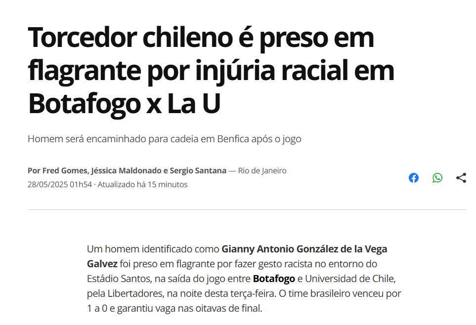 Una jornada negra vivió la hinchada de Universidad de Chile en Brasil. A la frustración por la eliminación de Copa Libertadores se sumó un hecho grave: la detención de un hincha por realizar gestos racistas contra seguidores de Botafogo.