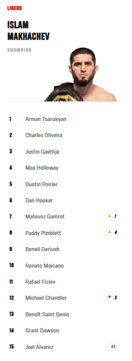 El evento UFC 314, realizado el pasado sábado, provocó importantes movimientos en la categoría. Paddy Pimblett derrotó a Michael Chandler y saltó al octavo puesto del ranking, mientras que Mateusz Gamrot ascendió al séptimo lugar. Chandler, en tanto, cayó cinco posiciones y ahora se ubica duodécimo.