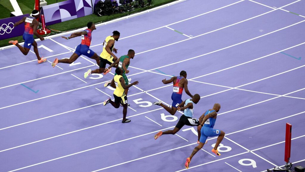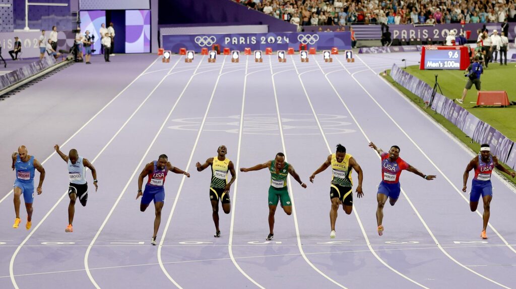 Noah Lyles ganó ese título y la medalla de oro en los 100 metros planos masculinos por el margen más estrecho —apenas cinco milésimas de segundo— este domingo por la noche en París, corriendo a toda velocidad por la pista del Stade de France e inclinándose para cruzar la línea de meta por delante del favorito, el jamaicano Kishane Thompson.
