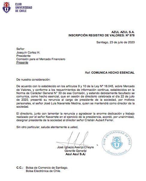 “El directorio, junto con la lamentar la renuncia y agradecer la enorme dedicación y trabajo realizado por el señor Navarrete en el ejercicio de la presidencia, acordó, en unanimidad, designar presidente de la sociedad al señor Cristián Aubert Ferrer”, firmó.