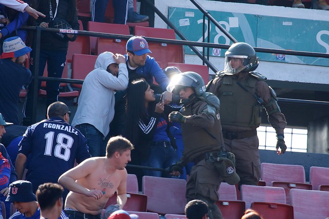 Los golpes y patadas se captaron desde lejos, algunas sillas volaron para frenar el actuar de fuerzas especiales. Algunos barristas terminaron detenidos.